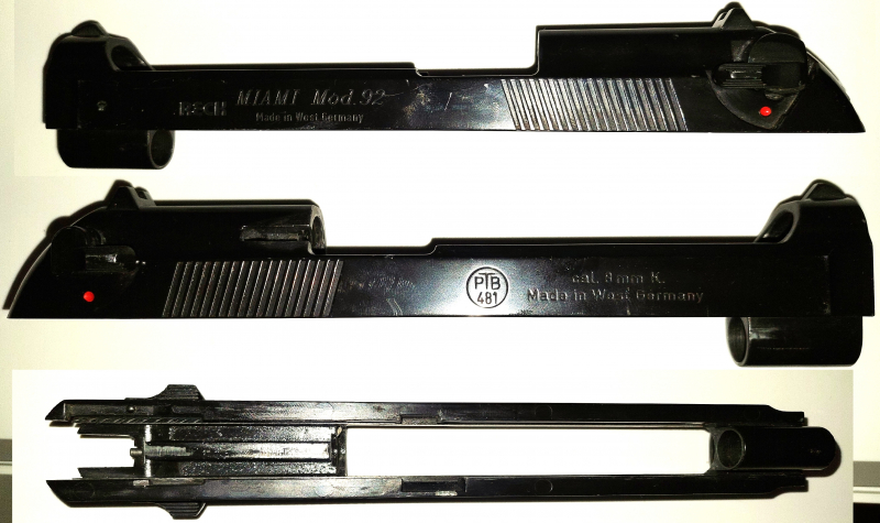 Aus Nachlass: Einen Ersatz-Schlitten für eine alte Schreckschusspistole von der Firma RECK, Mod. Miami Mod.92 im Kaliber 8mm K.