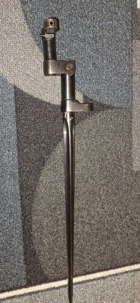 Das Bajonett ist die klassische Klappbajonett-Version des M1944 (auch als M44 bekannt). Es ist komplett mit Umklapp-Mechanik und funktioniert einwandfrei. Besonders erkennbar ist die einzelne Arretierung/Warze (die charakteristische einzelne Fixierwarze), die dieses Modell als frühe Fertigung bis 1945 (Zweiter Weltkrieg) ausweist.