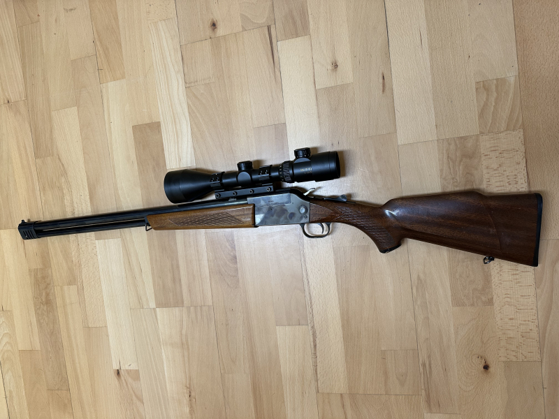 Sie bieten auf eine Bockbüchsflinte der Marke Tikka im Kaliber 12/70 .222 Rem. Die Waffe wird mit einem Hahn gespannt und mittels Schiebeschalter die Läufe umgeschaltet. Die abgebildete Optik ist nicht Gegenstand der Auktion.