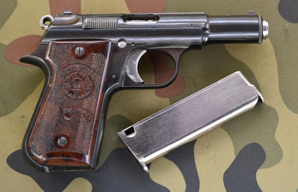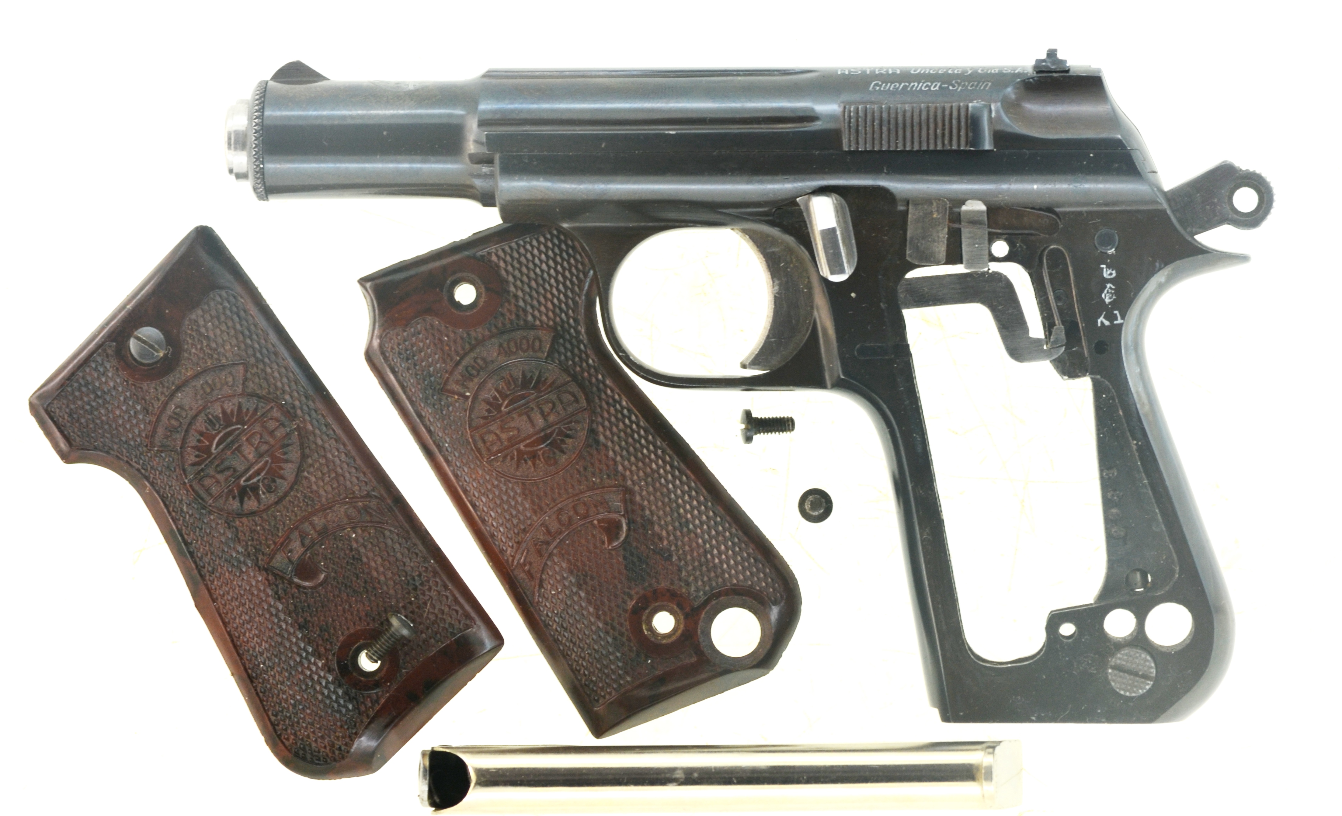 Kaliberangabe „7,65 mm .32“ auf dem Patronenlager, rundes Markenlogo „Astra“ oben auf Lauf, spanische Beschusszeichen (unter der linken Griffschale), codiert-datiert "K1" = 1965. Hersteller „ASTRA Unceta y Cia. S.A. Guernica - Spain", ASTRA Mod. 4.000“, Seriennummer "380330" rechts auf der Griffstückunterseite. Beide Griffschalen geprägt mit Modellbezeichnung und ASTRA-Rundlogo.