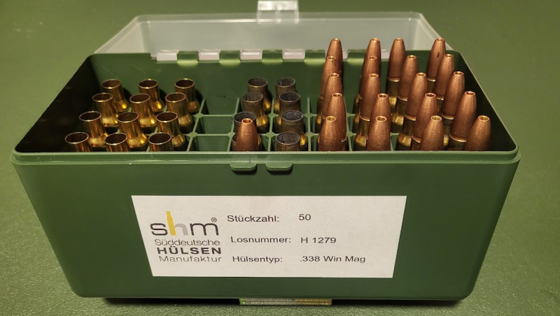 Im Kundenautrag aus Nachlaß bieten wir Ihnen an: SHM Hülsen, Geschosse und Patronen im Kal. .338 Win Mag. Die Patronen sind nur zum delaborieren und neu laden geeignet,