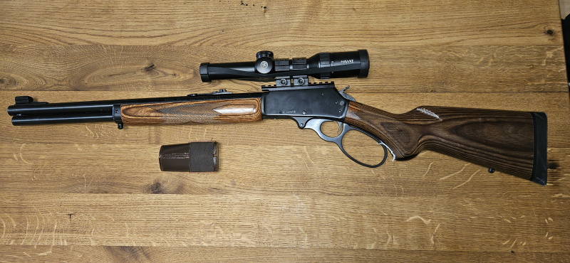 Zum Verkauf steht ein hochwertiger Unterhebelrepetierer der Marke Marlin im starken Kaliber .45-70 Government. Die Waffe befindet sich in einem sehr gepflegten Zustand und überzeugt durch ihre klassische Optik mit schön gemasertem Holzschaft sowie zuverlässiger Technik.