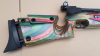 Anschütz 2002 Super Air Buntschaft. Das Luftgewehr schießt einwandfrei uns konstant. V0 173m/s mit 0,53 g Diabolos. Der Schaft hat einen Riss am Griff ( Bild 5 + 6 ). Außerdem hat der Schaft dellen und Kratzer und der Klarlack blättert teilweise ab. Am Gewehr ist ein verstellbares Ringkorn verbaut.