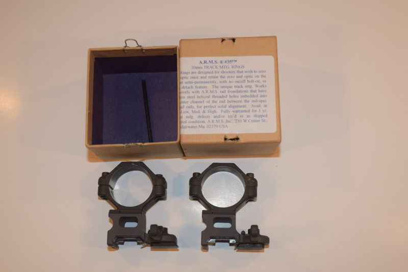 Montageringe für Zielfernrohr mit 30mm Mittelrohrdurchmesser, für Picatinny Schiene. Bauhöhe 35mm, Klemmung per Hebel. Hersteller A.R.M.S., original verpackt. Gebrauchsspuren. Versand nur als Paket wg. Sendungsverfolgung. Bei Versand ins Ausland berechne ich aktuelle DHL Versandkosten – bitte Höhe für Ihr jeweiliges Land erfragen. Privatauktion, daher keine Gewährleistung und keine Rücknahme.