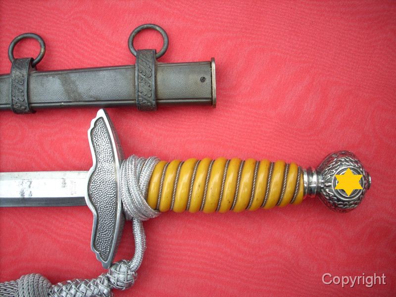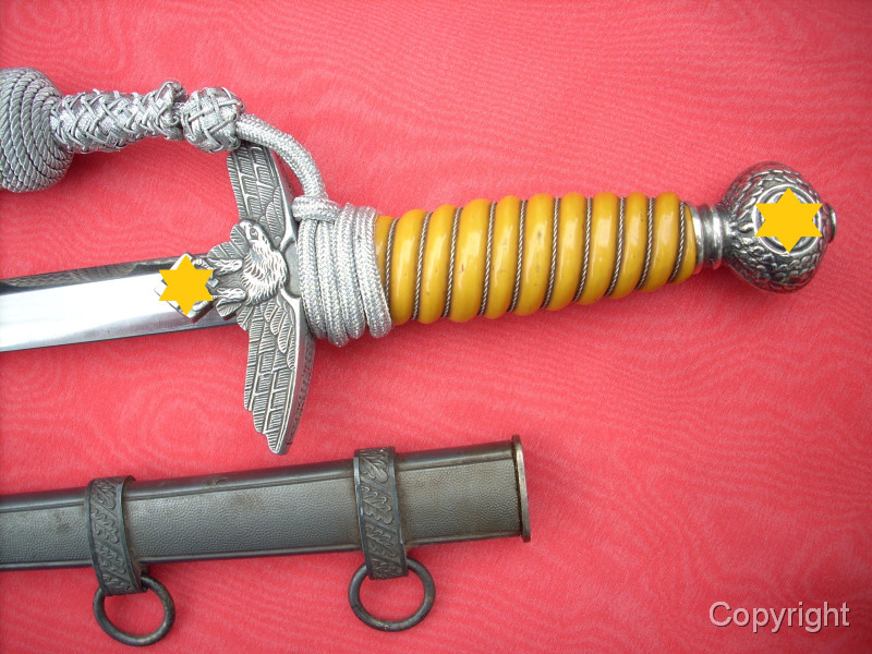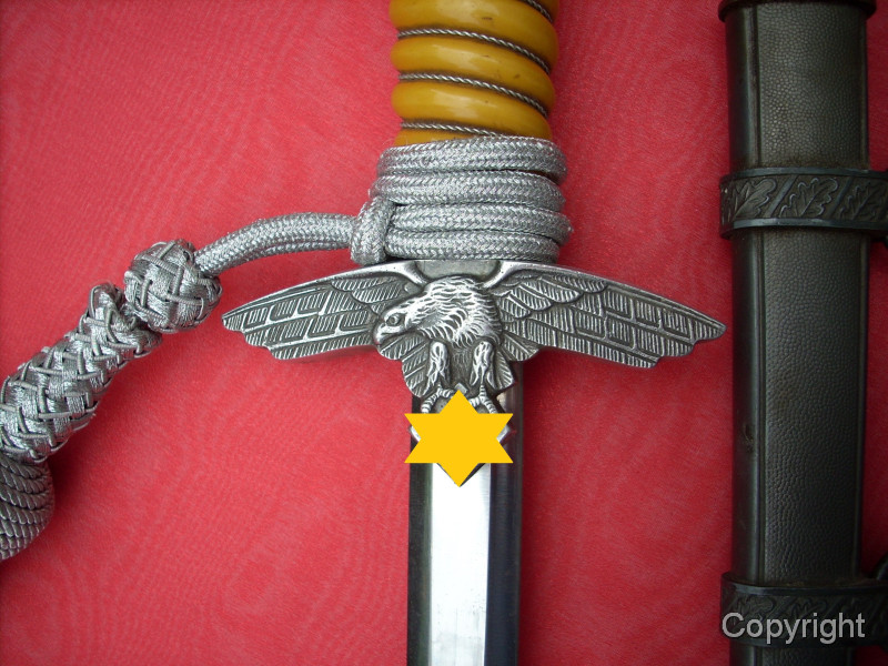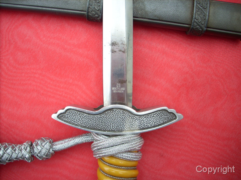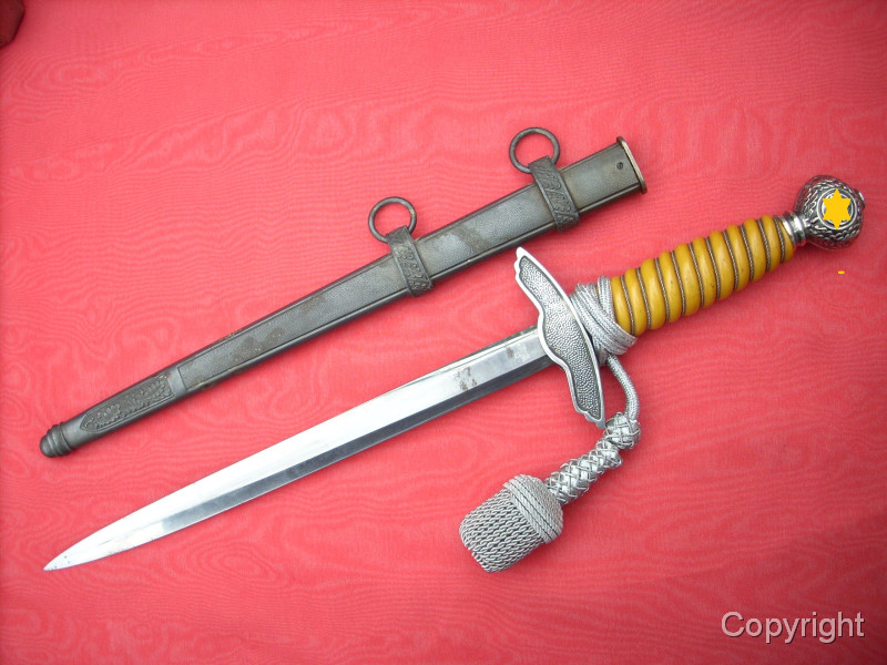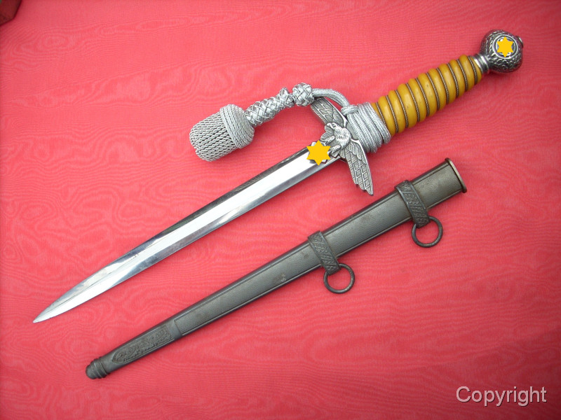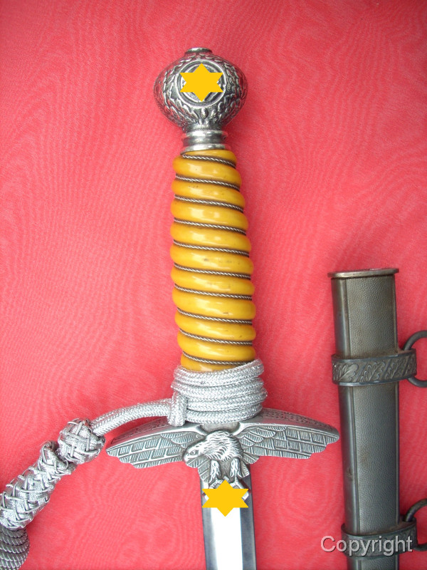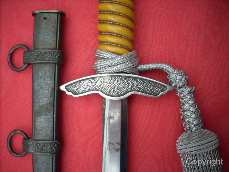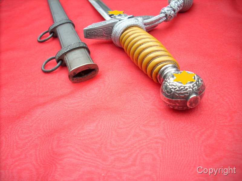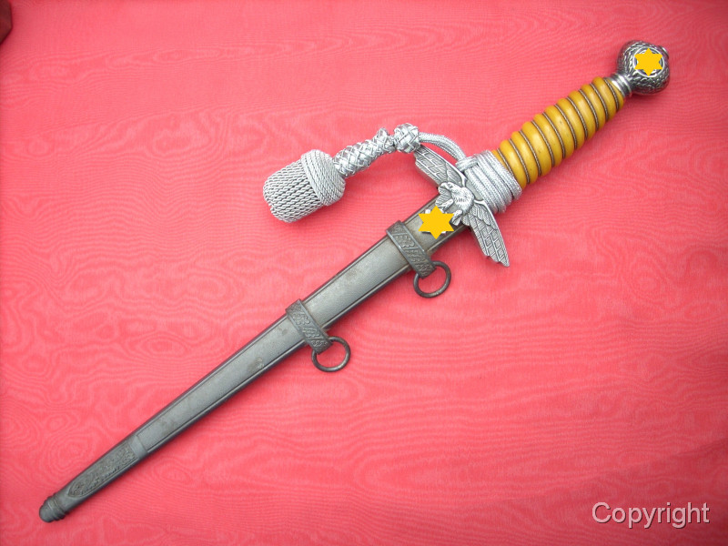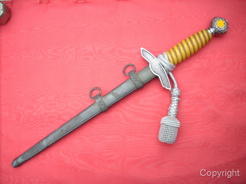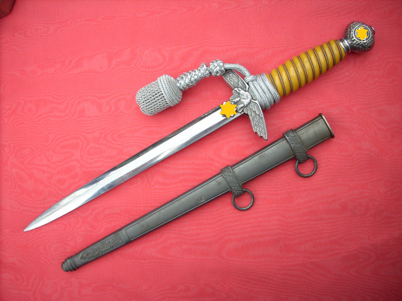 Toller Luftwaffenoffiziersdolch LOD mit gelb/orangem Griff und Portepée. Klinge und Scheidenkörper magnetisch, Trageringe antimagnetisch. Herstellerlogo Robert Klaas, Solingen. Hervorragender Gesamtzustand siehe Fotos, die, wie immer, Bestandteil der Artikelbeschreibung sind. Keine Garantie und keine Rücknahme.