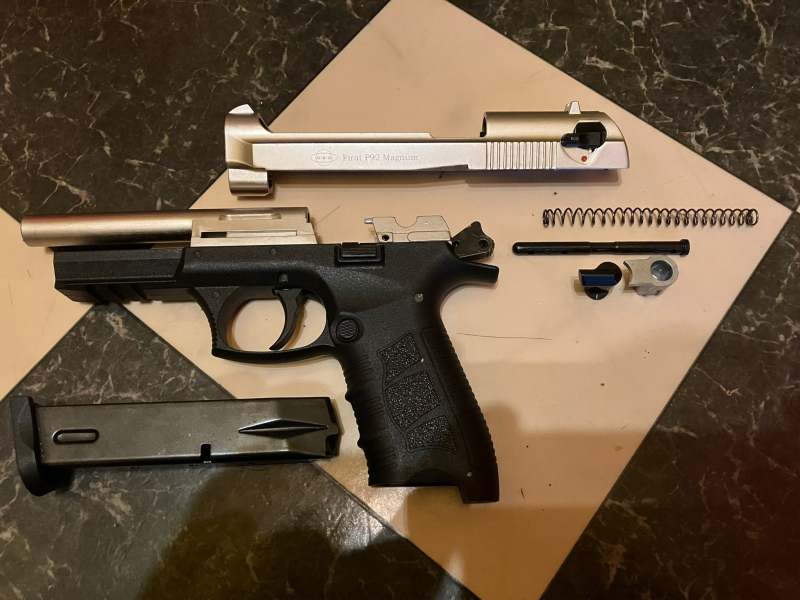 EKOL FIRAT P92 PTB 1057 /// GEWICHT 770 GRAMM /// KINDERLEICHT IN 7 TEILE OHNE WERKZEUG ZERLEGBAR /// LAUF + HAHN + FEDER + FEDERFÜHRUNG + ABSCHUSSBECHER AUS STAHL /// ALLE LEICHTEN GEBRACUHTSPUREN KLEINE PÜNKTCHEN MINI FLECKEN O.Ä SIND AUF DEN BILDERN SICHTBAR /// + KOFFER + 10 SCHUSS 9MM PAK KNALL + BAUMWOLLTUCH