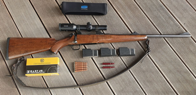 Repetierbüchse im Kaliber 8x57 mit Kahles Helia 1-5x24i auf EAW Schwenkmontage. Die Büchse wurde mit Glas und Montage vom Büchsenmacher kombiniert, eingeschossen, jedoch nie eingesetzt. Es wurden exakt 41 Schuß damit abgegeben und sie ist in neuwertigem Zustand. Seidenweicher Schloßgang, Abzug 550g, horrizontale Dreistellungssicherung, freischwingender 51cm Lauf, inkl drei Magazinen, dem abgebildeten Zubehör und ca 100 Patronen (Jagd- und Scheibenmunition mit gleichem Geschoßgewicht). Der Schaft hat im Kolbenbereich ein paar Macken, welche er bereits beim Händler hatte. NUR ABHOLER. Privatverkauf.