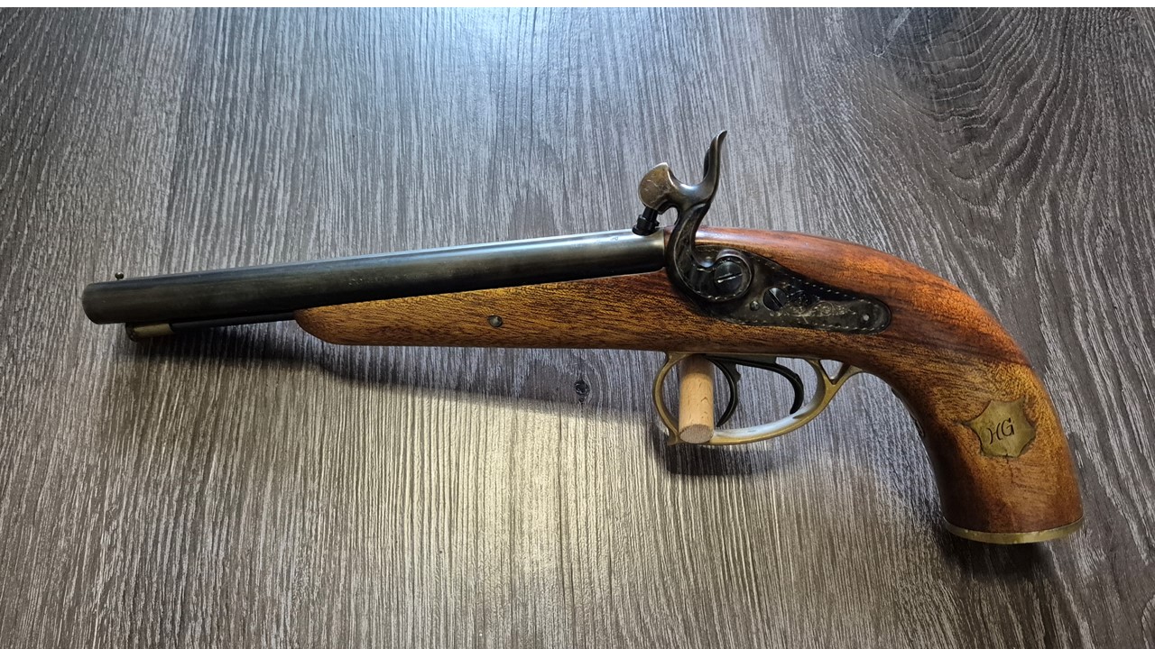 ich biete heute aus meiner Sammlung eine doppelläufige Perkussionspistole Corsair (Schwarzpulver) made in Italy im Cal .44 an.