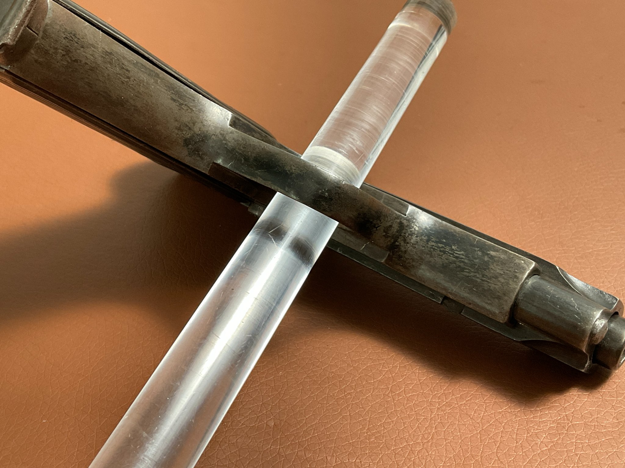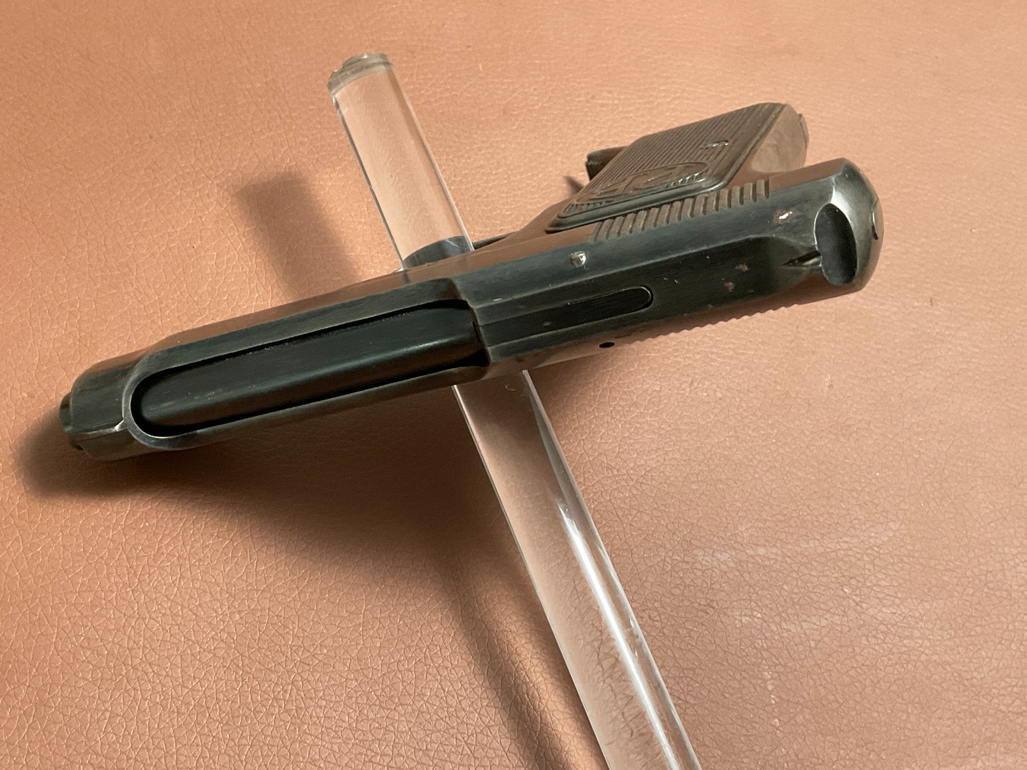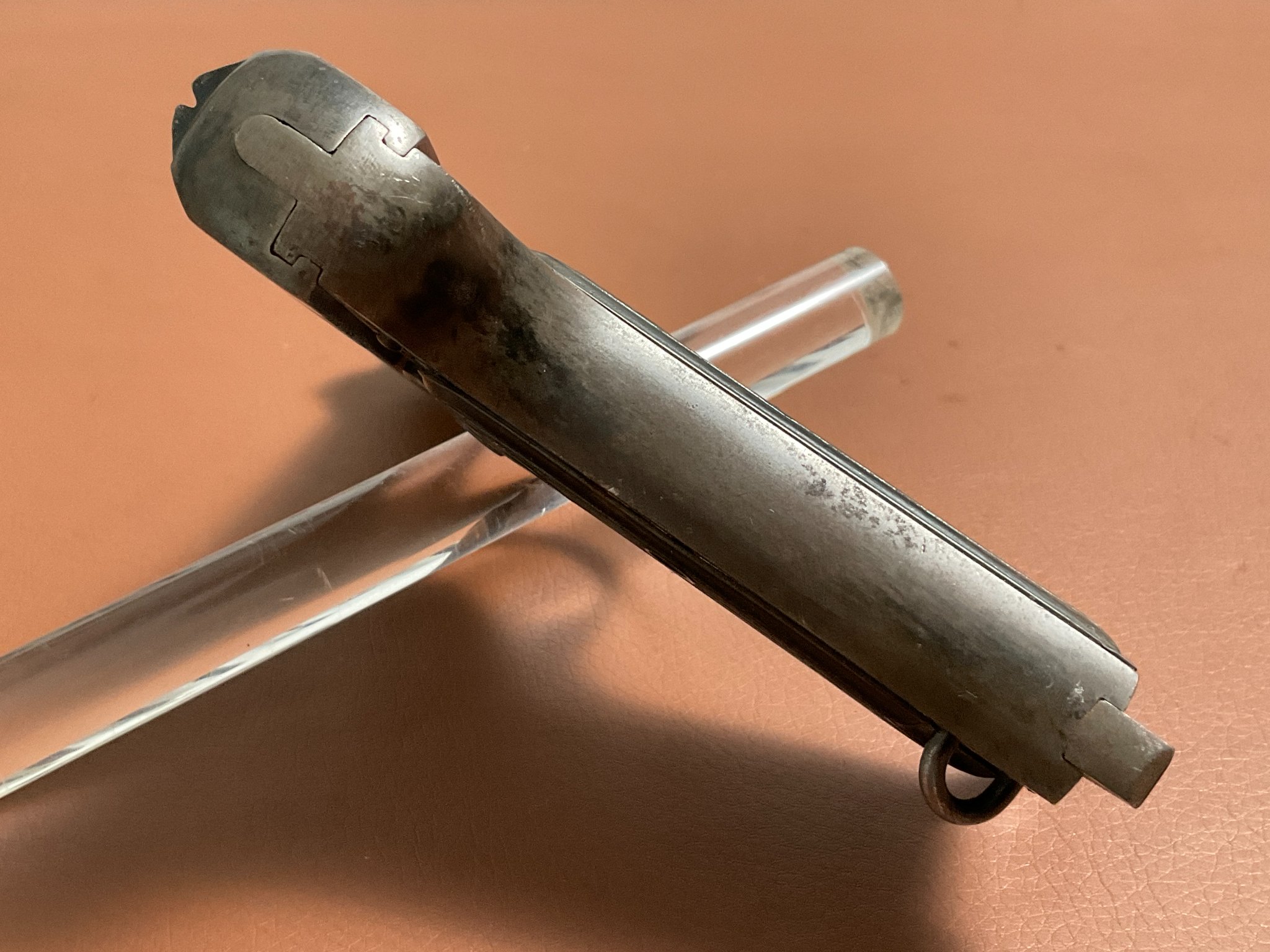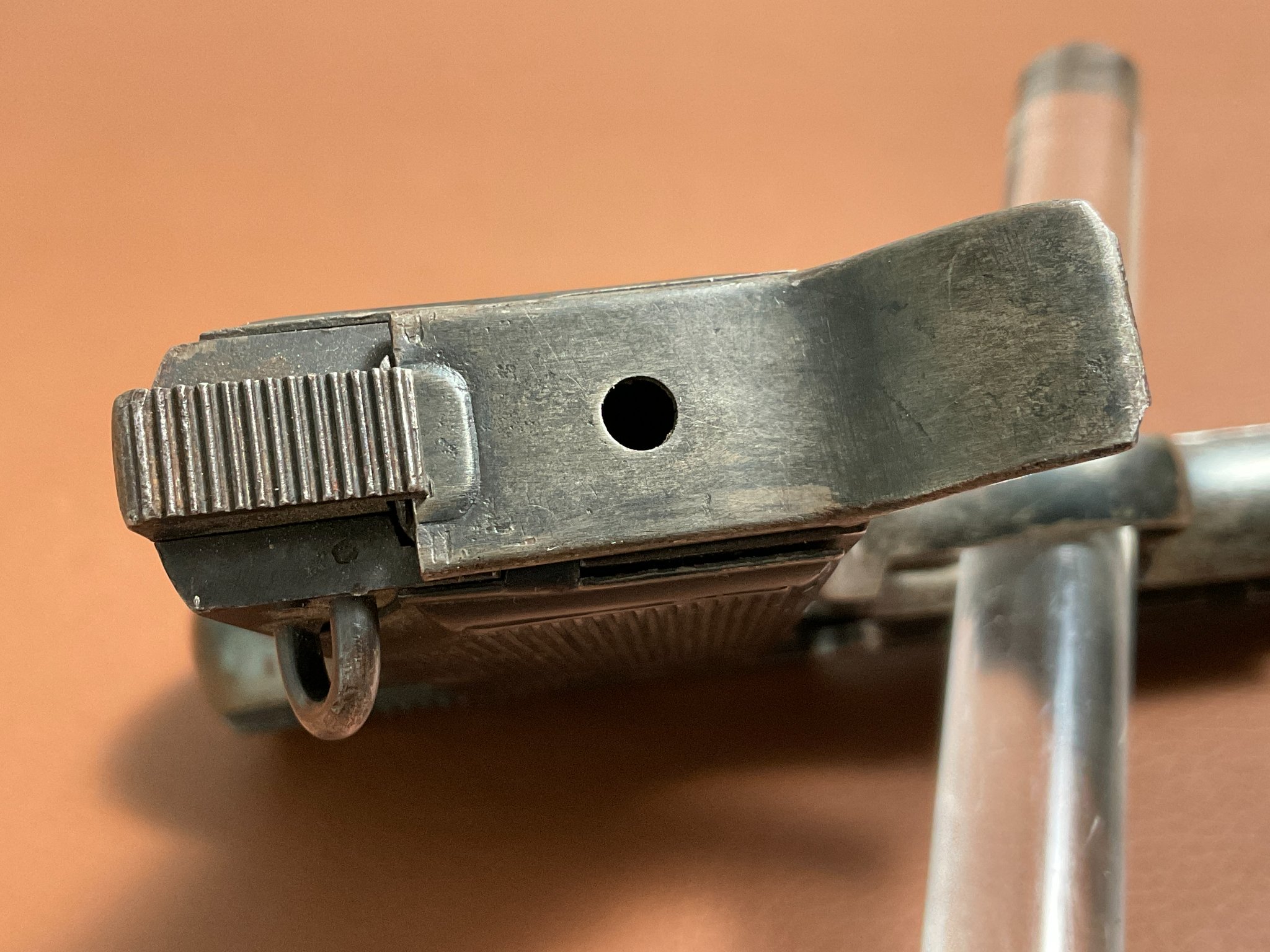 Die Waffe befindet sich in gebrauchtem Zustand und weist deutliche Handhabungsspuren an der originalen Brünierung auf.