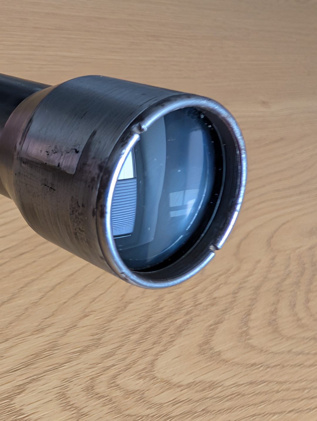 Die Brünierung ist kaum noch vorhanden und der Stahltubus hat viele Kratzer. Außerdem ist noch das Lot an den Stellen vorhanden, wo die Montagefüße befestigt waren. Es gibt viele kleine Stellen mit Oberflächlichen Rost, teilweise auch kleine Rostnarben. Auf den Linsen gibt es Nebel, aber sie sind noch in Ordnung und die Durchsicht ist gegeben. Das Absehen ist etwas schief und ausgefranst (siehe Bilder). Die Absehenverstellung ist etwas schwergängig aufgrund des alten Fettes, dafür lässt sich der Fokus problemlos einstellen. Auch die Schraube zur Arretierung der Absehenverstellung lässt sich bewegen.
