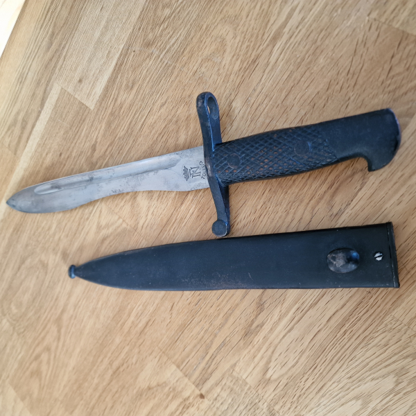Sie bieten hier auf ein sehr schönes Bajonett Toledo, Spanien. Gesamtlänge mit Bajonett: 39,5 cm / Klingenlänge: 24, cm. Verkauf nur an Personen über 18 Jahren!