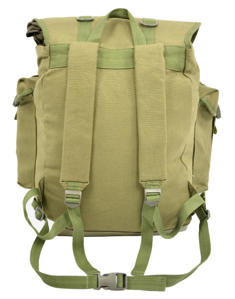 Gebirgsrucksack (neues Modell) als Nachbau wie er in der Deutschen Bundeswehr verwendet wurde, verstellbare und gepolsterte Tragegurte, verstellbarer und abnehmbarer Beckengurt, oben mit Tragegriff, Deckel mit 4 Kunststoff-D-Ringen und 2 Klickverschlüs- sen, flachem Einsteck- fach (z.B. für Iso-Matte),