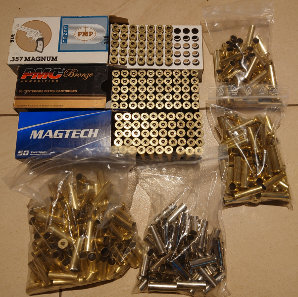 Ich bitte hier insgesamt 389 Hülsen im Kaliber 357 Magnum von verschiedenen Herstellern an. Sie wurden noch nicht wiedergeladen und es sind 48x Remington, 54x Fiocchi/GFL, 50x PMC, 35xPMP und 202 von Magtech/CBC wobei 43 vernickelt sind. Die Hülsen wurden schon entzündert und im Nasstumbler gereinigt.