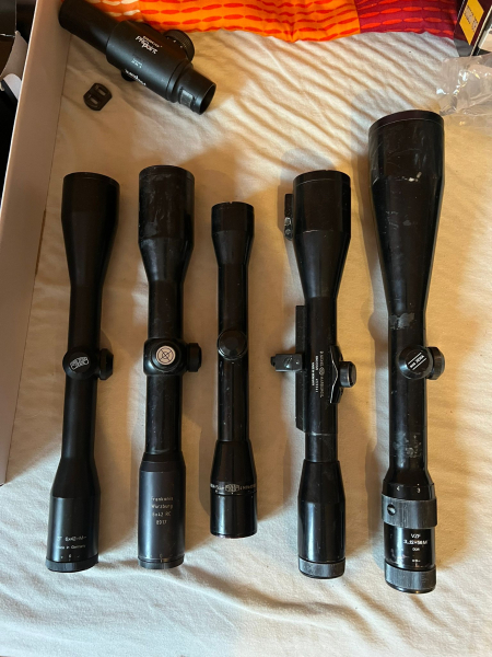 Verkauft wird Zielfernrohr Konvolut bestehend aus Zeiss 6x42 Abs.1, Frankonia (Docter oder Schmidt Bender( 6x42 RC Abs. 1 (mit entfernter Schiene), Kahles Helia Super 4x32 Absehen 4 mit Schiene, Nickel 6x42 Absehen 1, Zeiss oder Docter VZF 3-12x56 M.