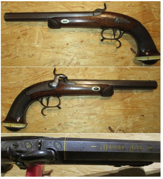 Angeboten wird hier eine originale Perkussionspistole im Kal. 13 mm/ .50 als Nr.2 aus einem Duell-Pistolenpaar, vermutlich belgische Fertigung um 1850. Die Waffe ist gefertigt aus Damaststahl mit Haarzügen im aushakbaren Lauf, reich graviert und mit Tauschierungen in Gold „Nr.2“ und „Damas Fin“ sowie einem Elfenbeinring am Kolben. Vermutlich keinen Stecherabzug. Der Zustand der Pistole ist altersentsprechend gut mit leichten, alterstypischen Gebrauchsspuren. Voll funktionsfähig bei guter Schussleistung. Als Zubehör inbegriffen ist eine gebrauchte LEE Gußform Kal. .50 in Doppelausführung sowie Putz-u. Ladewerkzeug mit Spezial-Schraubendreher, Kugeln und Pflaster. Zustand siehe Bilder. Privatverkauf im Auftrag. Ausschluß der Sachmängelhaftung. Keine Rücknahme. Versand per DHL mit Sendungsverfolgung. Versand nur innerhalb der BRD.