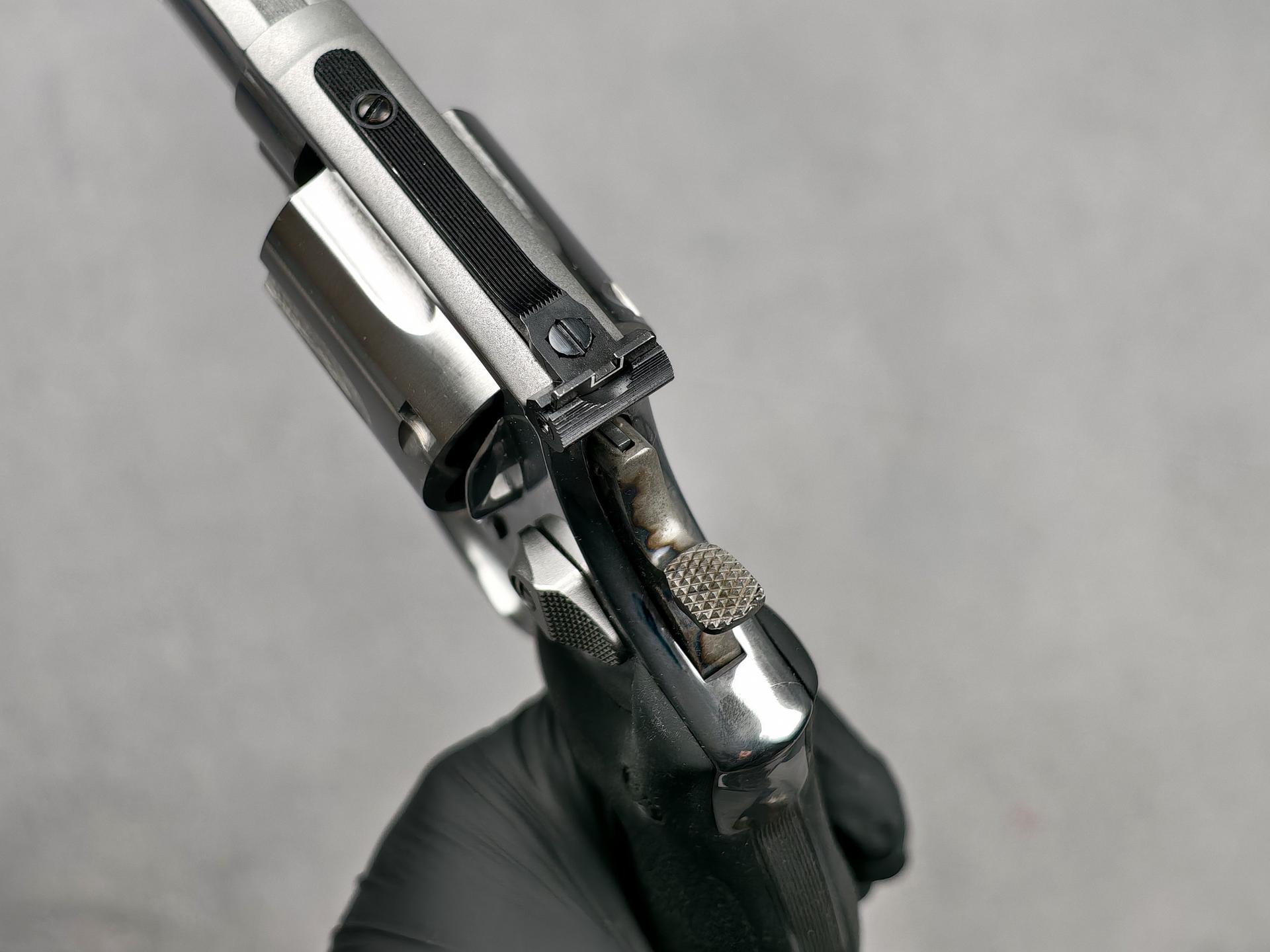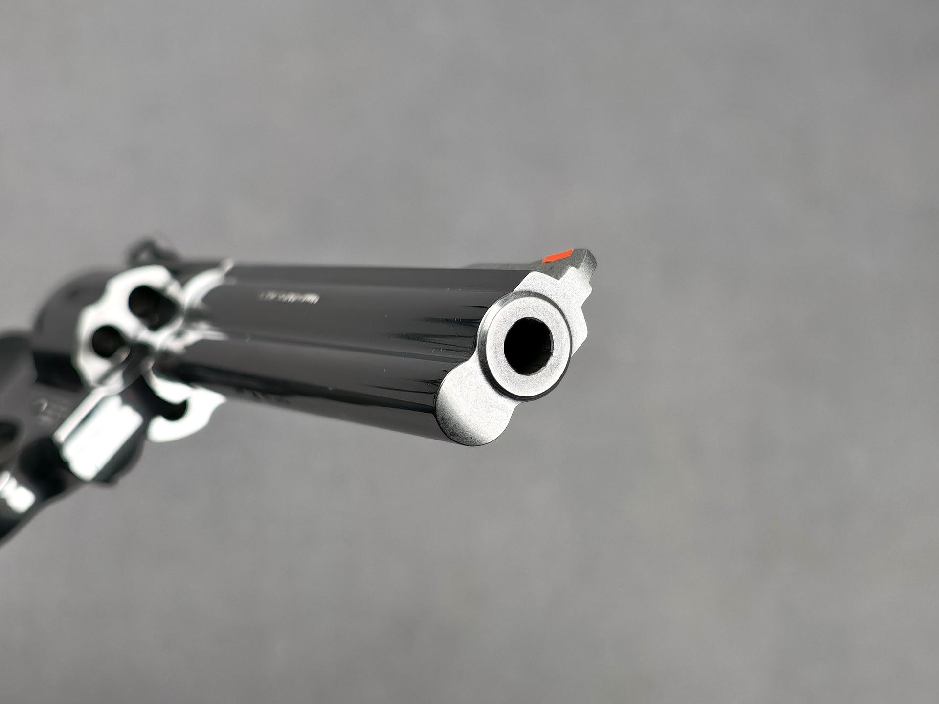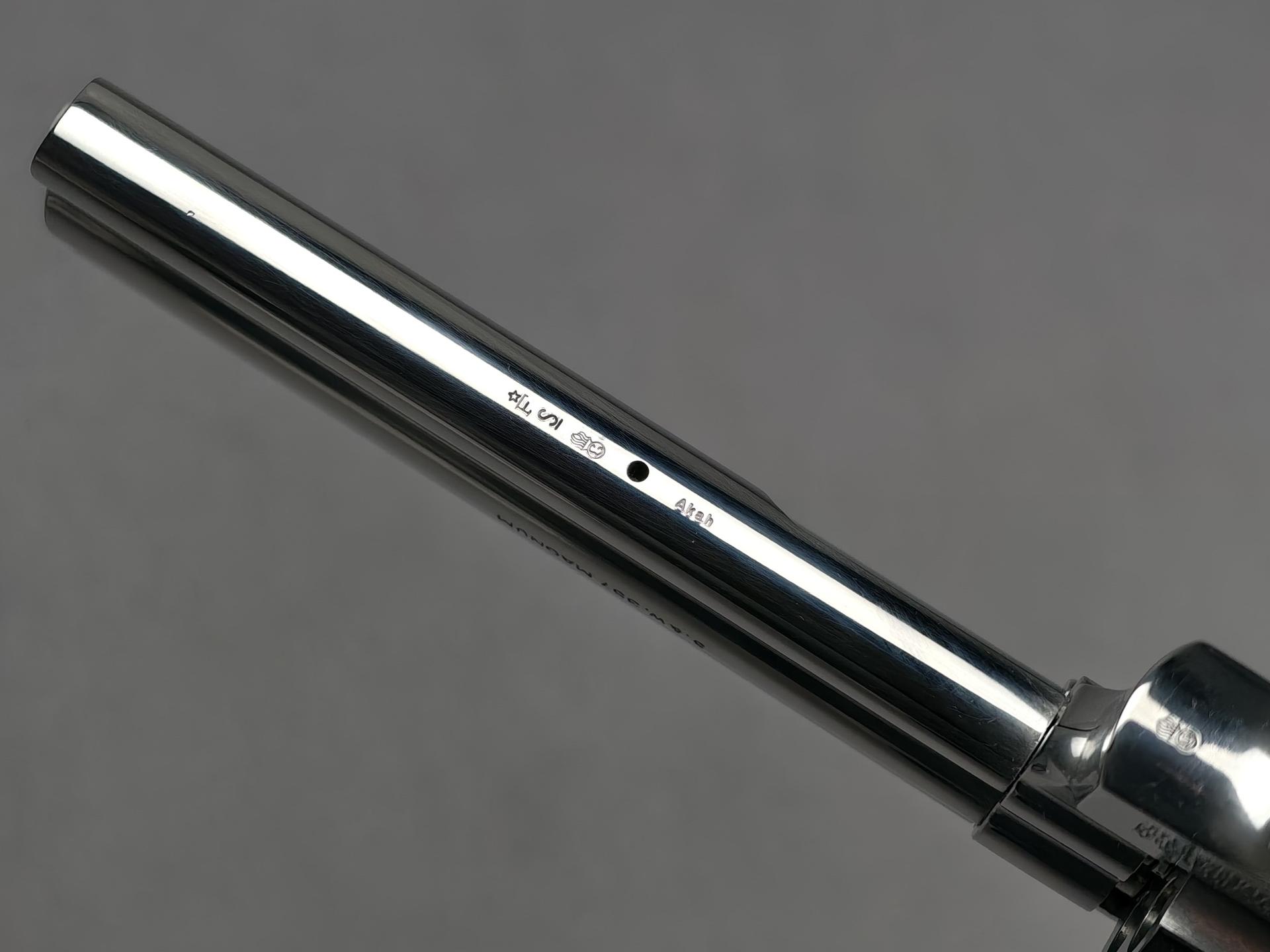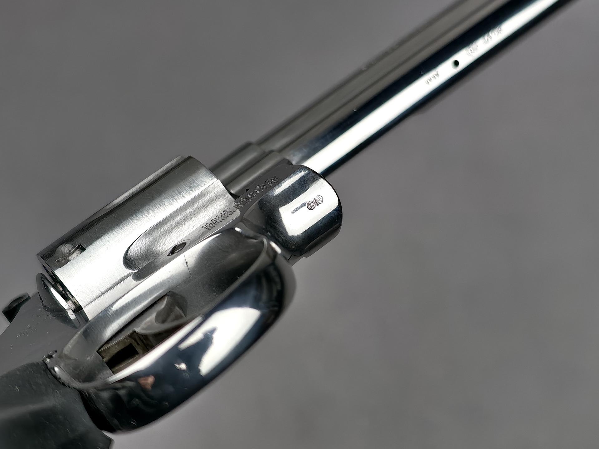 Die angebotene Waffe ist im guten, wenig gebrauchten Zustand. Sie wurde wohl wenig geschossen und immer gut gepflegt. Rundum gibt es leichte oberflächliche Gebrauchsspuren, wie auf den Fotos zu sehen. Das Hochglanzfinish ist schön erhalten und kontrastriert mit der "buntgehärteten" Optik von Abzugszüngel und Hammer. Die Mechanik überzeugt mit einwandfrei sauberem Trommeltransport, knackigem Spannvorgang und trockenem Abzug. Das Laufprofil ist sehr gut.