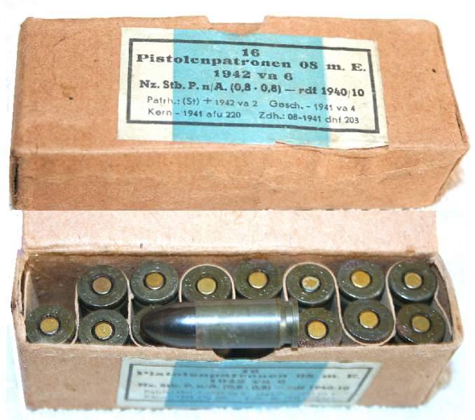 Sie bieten auf ein Päckchen mit 16 Stück 9 mm Pistolenpatronen 08 m E ( mit Eisenkern ) der Wehrmacht aus dem 2. Weltkrieg. Hergestellt 1942 von va ( Kabel - und Metallwerke Neumeyer A.G. Nürnberg ) . Weiteres siehe Fotos, sie zeigen das Päckchen aus dieser Auktion. Privatverkauf aus Sammlungsauflösung