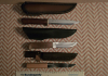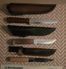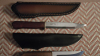 3 x unbenutzte Jagdmesser aus Sammlervitrine mit Lederscheiden.
