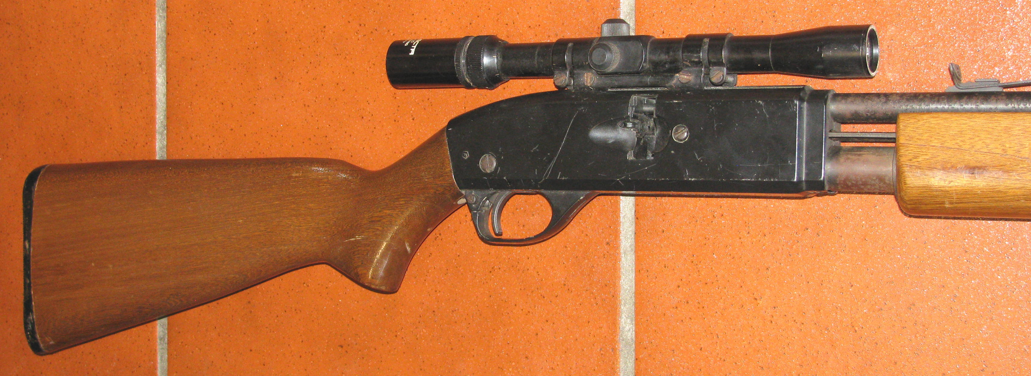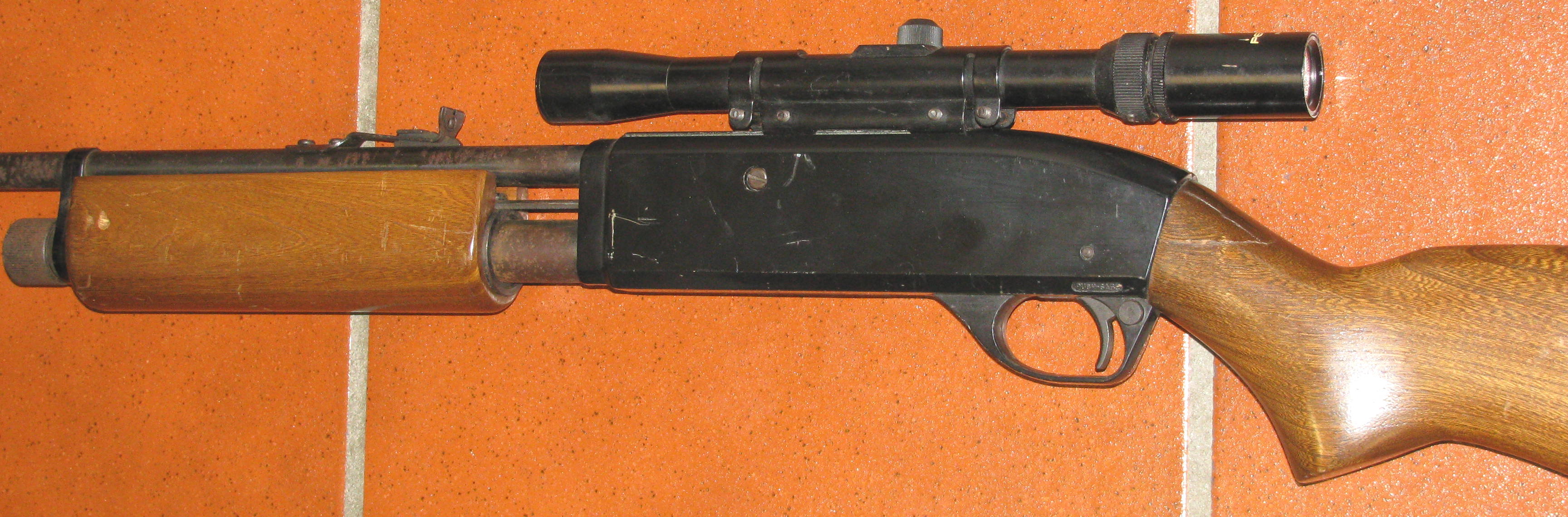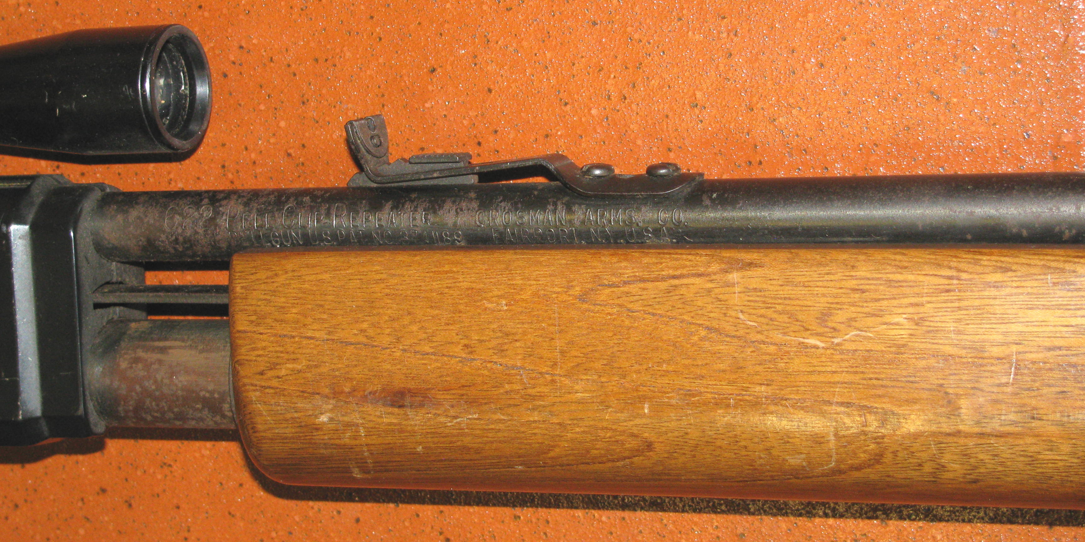 Zum Verkauf kommt ein seltenes CROSMAN CO2 Luftgewehr, ein 622 PELL CLIP REPEATER mit Zielfernrohr und F - Zeichen