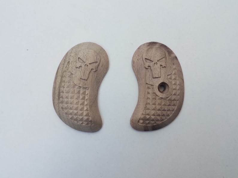 Die Griffschalen haben eine Punisher-Gravur drauf und sind unversiegelt auf der Oberfläche, damit der Verbraucher die Griffschalen nach seinem eigenen Wunsch färben (beizen), ölen oder wachsen kann.