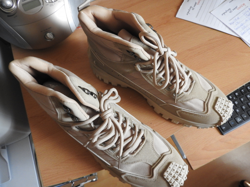 Biete eine Paar sandfarbene taktische Einsatzstiefel der Größe 43 aus Synthetik-mesh mit rutschfester Profilsohle und verstärktem Zehenschutz. Es handelt sich um Neuware. Die Schuhe haben vier Paar Zuglöcher und drei Paar Zugösen und sind strapazierfähig.