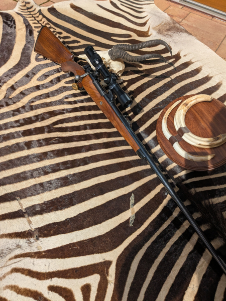 Hier biete ich zum Kauf etwas ganz besonderes an. Ein 98er der in Indien gefertigt wurde bzw aus einer Waffe aus deutscher Fertigung in Berlin. Das erste Safariland war Indien, nicht Afrika, was viele nicht wissen. Hier wurden die ersten Safarikaliber zum Einsatz gebaucht. Diese Waffe soll wohl von einem Maharadsche vom Elefant aus zur Tigerjagd eingesetzt worden sein, diese Geschichte wurde mir damals mit verkauft :-))) Flügelsicherung abgeschrägt, Druckpunktabzug, bricht sauber und genau passend, 3 Klappen Expressvisier, Neusilber Perlkorn, kräftig zur schnellen Erfassung, der Lauf ist 65cm Lang, Schwenkmontage, Glas Doktor 1,2-5x32 M Absehen 4, ich weis nicht ob die Waffe nochmal eingeschossen werden muss, denke ja. Am Glas sieht man rutschspuren. Restmun kann auch noch erworben werden. Alles in allem eine Top erhaltene gute Waffe für alles. Folgende Aufschrift, Neubeschuß 1988, 10,75 Mauser, Walter Lockm und Co LTD, Calcutta, Lahore & Delhi. Für weitere Bilder und Infos, einfach schreiben.