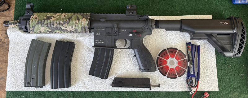Servus Leute, ich biete hier im Auftrag meines Kumpels sein Hk 416 Gewehr 6mm BB an. Das Gewehr hat einen Mosfet Umbau ( siehe Foto), es wurde nachträglich ein Tuning Motor verbaut, sowie ein Max Hop up Unit, ein Tuning Lauf sowie eine 140er Feder. Ladegerät und Akku ist ebenfalls dabei, ebenso Speedloader und 3 Magazine. Das Teile wurde zwar komplett getunt, aber wegen umstieg auf scharfen Schießsport nie bespielt. Schaut euch die Fotos an und falls Fragen sind, dann einfach eine Mail senden.
