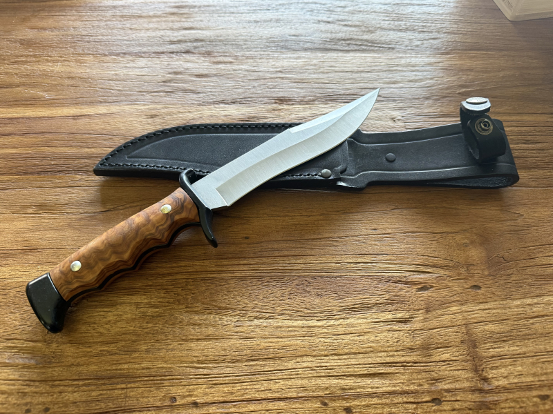 rostfreie Klingenstahl AN.58 Griff ist mit attraktiven Olivenholz-Schalen versehen. Fingermulden, Handschutz sorgen für Sicherheit. Mit schwarzer Lederscheide.