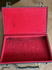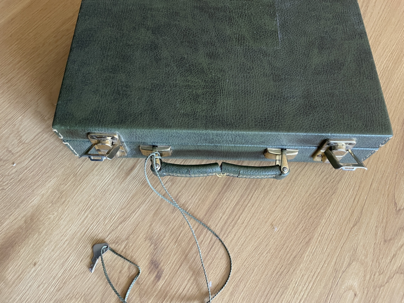 Der Koffer ist innen geringfügig größer als DIN A4, ist außen mit grünem, dunkelschattierten Kunstleder im Kroko-Look bezogen und innen mit rotem Flauschstoff ausgekleidet. Der Schlüssel für die beiden Schlösser ist dabei.