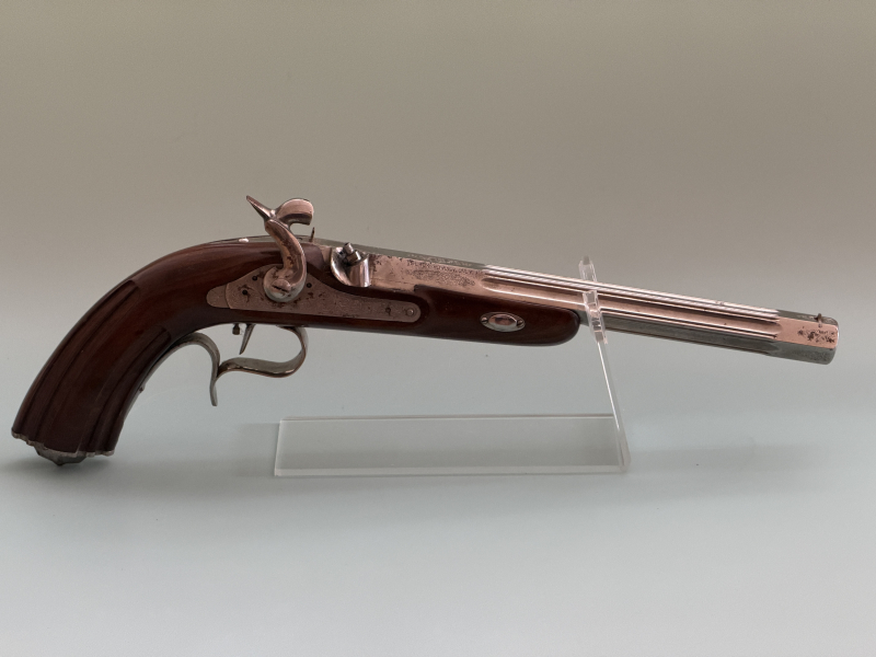 Diese edle Perkussionspistole vereint historische Eleganz mit moderner Präzision. Inspiriert von französischen Duellpistolen des frühen 19. Jahrhunderts, besticht sie durch hochwertige Materialien und eine sorgfältige Verarbeitung.