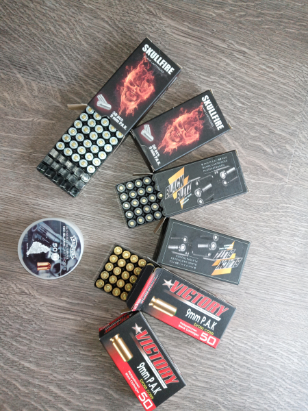 Es sind 100 x Victory 9 mm P.A.k , 100 x Black Blitz und 85 x Skullfire Patronen und 50 x 9 mm R.k. Knallpatronen enthalten.
