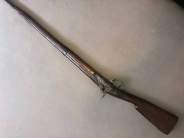 Französische Muskete aptiert auf Perkussion. Merbeuge? Mutzig, oder so ähnlich auf dem Schloss, Gewehr ist gekürzt, Schloss funktioniert hervorragend, Ladestock nicht vorhanden, JA Stempelung auf beiden Seiten des Kolbens, auf der Schwanzschraube befindet sich die Nummer 84, was auch immer das zu bedeuten hat. Teile Nummerngleich. Gesamtlänge 113 cm, Lauf 74 cm ohne Schwanzschraube. Alte Reparaturstelle am Kolben.
