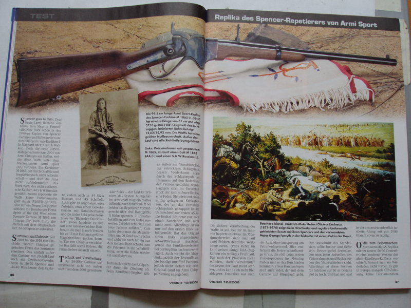 Für Waffenfreunde; Pistolen- und Gewehrschützen +++ angeboten wird ein Visier - Heft mit einem für Westernfreunde sicher sehr interessanten Bericht ++ ** Spencer Repetierer M 1865 in .56-50 ** -- Replika des Spencer-Repetierers Armi Sport -- ** Medicine Gun ** so nannten die Indianer das Spencer Repetiergewehr mit dem im US-Bürgerkrieg die Yanees schon den Rebellen zugesetzt hatte. 140 Jahre später kommt endlich ein Nachbau im originalen Kaliber. Lesen Sie den ausführlichen Testbericht (8 Seiten) mit Ergebnissen vom Schießstand. +++ und es gibt noch weitere interessante Berichte z.B. für Pistolen-Schützen (14 Seiten) - ** Am Anfang stand die Glock -- Zehn Pistolen mit Polymer-Griffstück im Vergleichstest **+++ Das Heft ist gebraucht , befindet sich aber in einem sehr guten Zustand +++ Der Versand erfolgt als Großbrief mit DHL (unversichert) ; die Versandkosten gelten nur für Deutschland.+++ Bieter aus dem Ausland bitte Versandkosten vor Gebot erfragen. +++ Versandrabatt möglich, sehen Sie auch meine anderen Angebote. +++ Privatverkauf, daher keine Gewährleistung, Garantie oder Rücknahme. 0612 +++ Fragen bitte mailen.