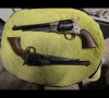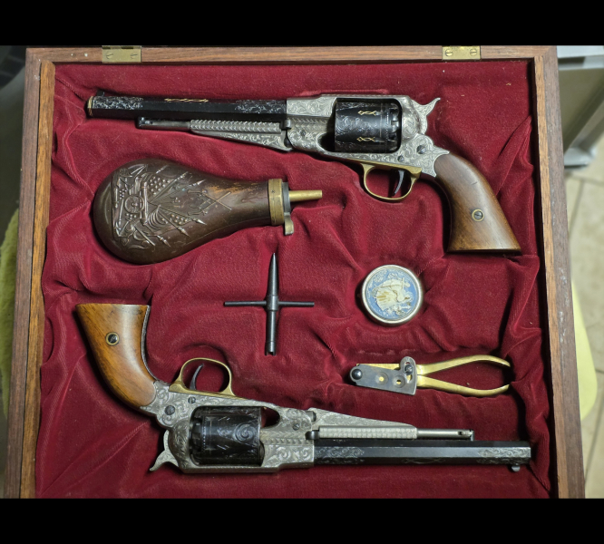 Gute Dinge!!!! 2 x Gutes Ding!!! 2 Vorderladerrevolver für Schwarzpulver incl. hölzerne, stoffausgeschlagene Aufbewahrungsbox und Zubehör (Pulverflasche, Kugelzange, Wekzeug, Dose für Stopfen),
