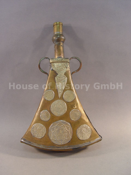 Pulverflasche für Schießpulver Orient / Marokko aus Messing/Kupferblech um 1900, vorderseitig mit aufgelegten Silbermünzen (osmanischen Akce datiert 1299, marokkanischen Dirham und Rial datiert 1321 und 1329), komplett mit zwei Tragebügeln, Flaschenverschluss fehlt, dekoratives Stück