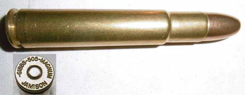 eine Deko-Patrone .505 Gibbs (GIBBS -505-Magnum JAMISON ) Patrone ist ohne Ladung, zum Nachweis ist eine Klapper-Kugel eingelegt.