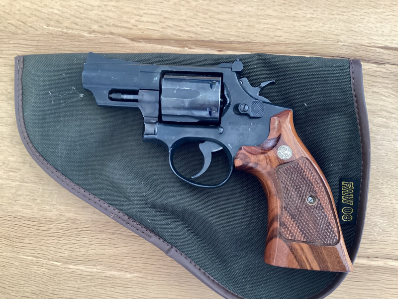 6-schüssig DA Revolver aus Stahl mit schönen Holzgriffschalen. Kaliber 9mm Knall