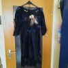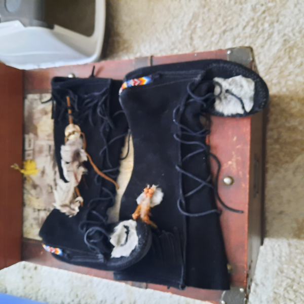 Indianerkleid Leder schwarz mit Perlen bestickt ,Messer, Haarschmuck ,Schuhe,Felltasche ,Halsschmuck Indianergürtel alles komplett.