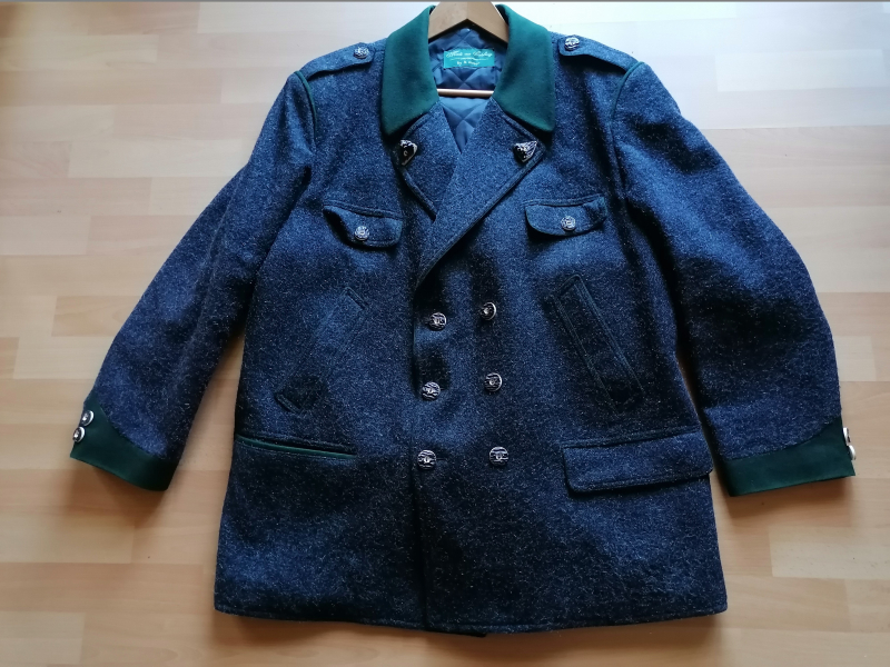 Sie bieten auf einen wunderschönen zweireihigen Trachtenjanker von der österreichischen Tradionsfirma Moser aus Salzburg. Es handelt sich um ein Modell vom Typ "Schladminger". Als Material wurde hochwertige Wolle (u.a. auch Mohair) in schwarz und mit hellem Stichelhaar durchsetzt verwendet. Kragen und Aufschläge sowie die Manschetten wurden in lodengrün abgesetzt (siehe Fotos). Auf der Vorderseite befinden sich 4 Taschen, die unteren sind mit Klappen versehen (auf dem Foto ist eine Klappe in die Tasche umgeklappt).