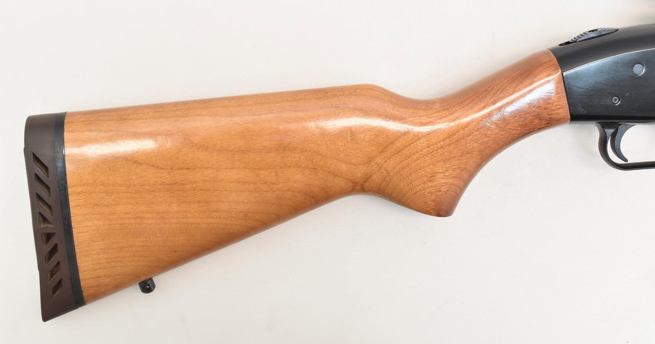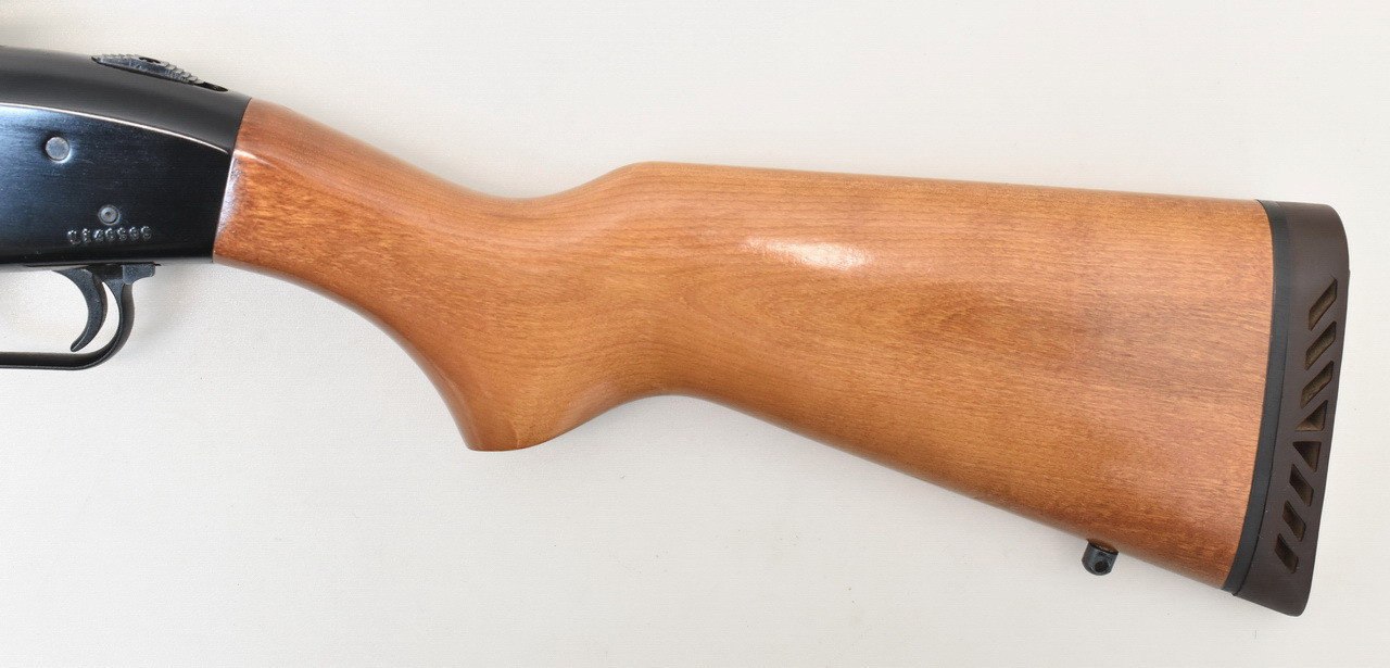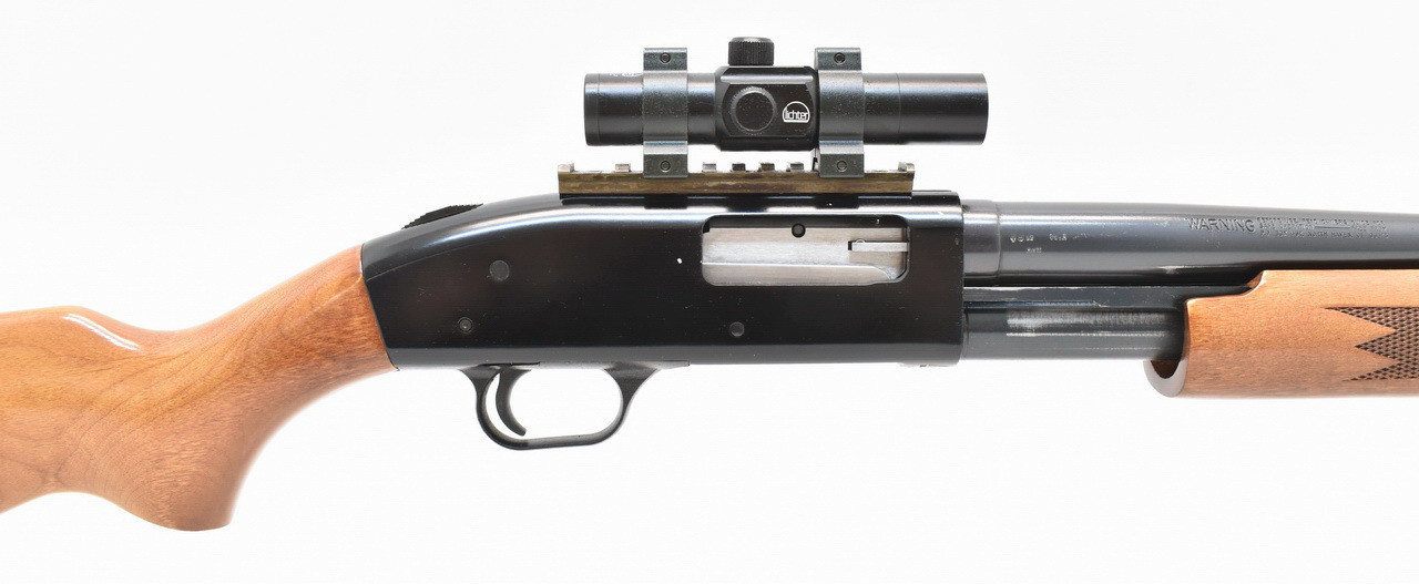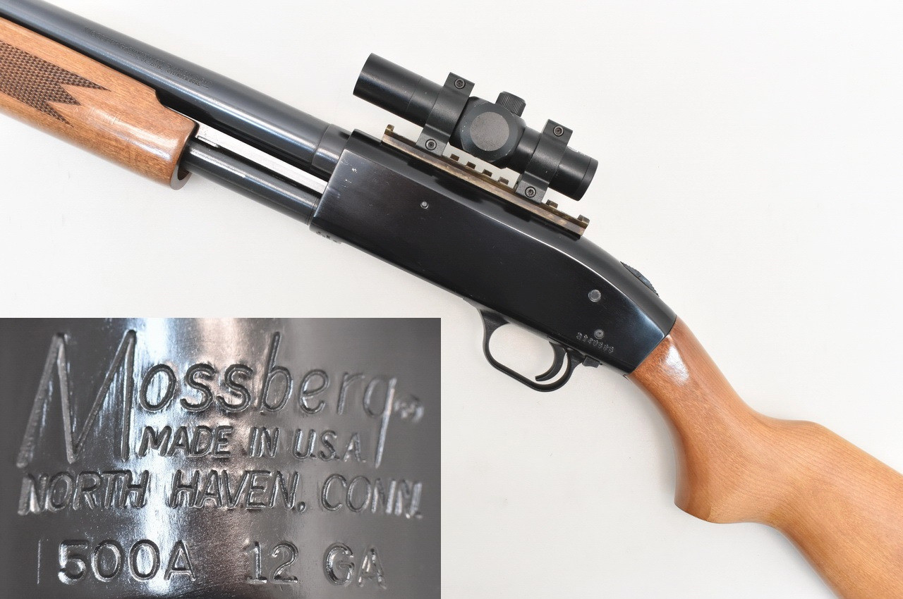 Gebrauchte, sechsschüssige " Pump - Action " / Vorderschaftrepetier - Flinte Modell 500 A aus Produktion des bekannten amerikanischen Herstellers MOSSBERG. Blanker 20,7" Lauf mit Cylinderchoke; im Mündungsbereich partiell narbig. Kölner Beschuß 1992. Kettner Vertriebsstempel. 350mm langer, gerader Pistolengriffschaft für Rechts- und Linksschützen ( Schaftlänge gemessen vom Abzug bis Mitte Gummischaftkappe ). Später hinzugefügte Weaver Stahl - Montageschiene mit montiertem LICHTER Rotpunktvisier / Red Dot. Details siehe Bilder.