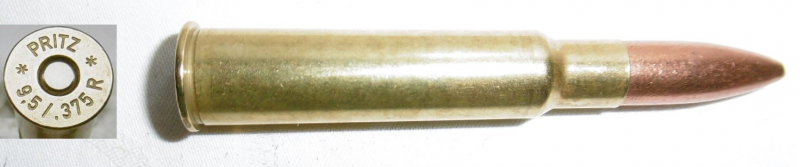 eine Deko-Patrone .375 Pritz, ein Eigenkaliber des österr. Büchsenmachers Pritz ( * PRITZ * 9,5/.375 R ) Patrone ist ohne Ladung, zum Nachweis ist eine Klapper-Kugel eingelegt.