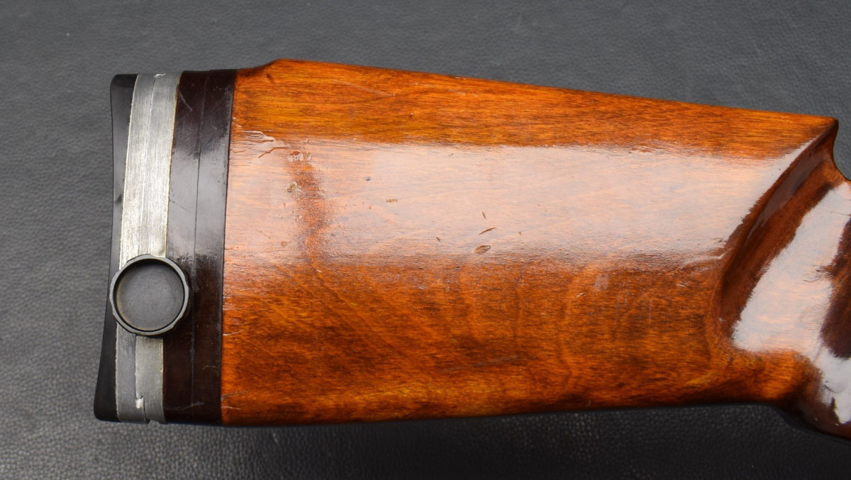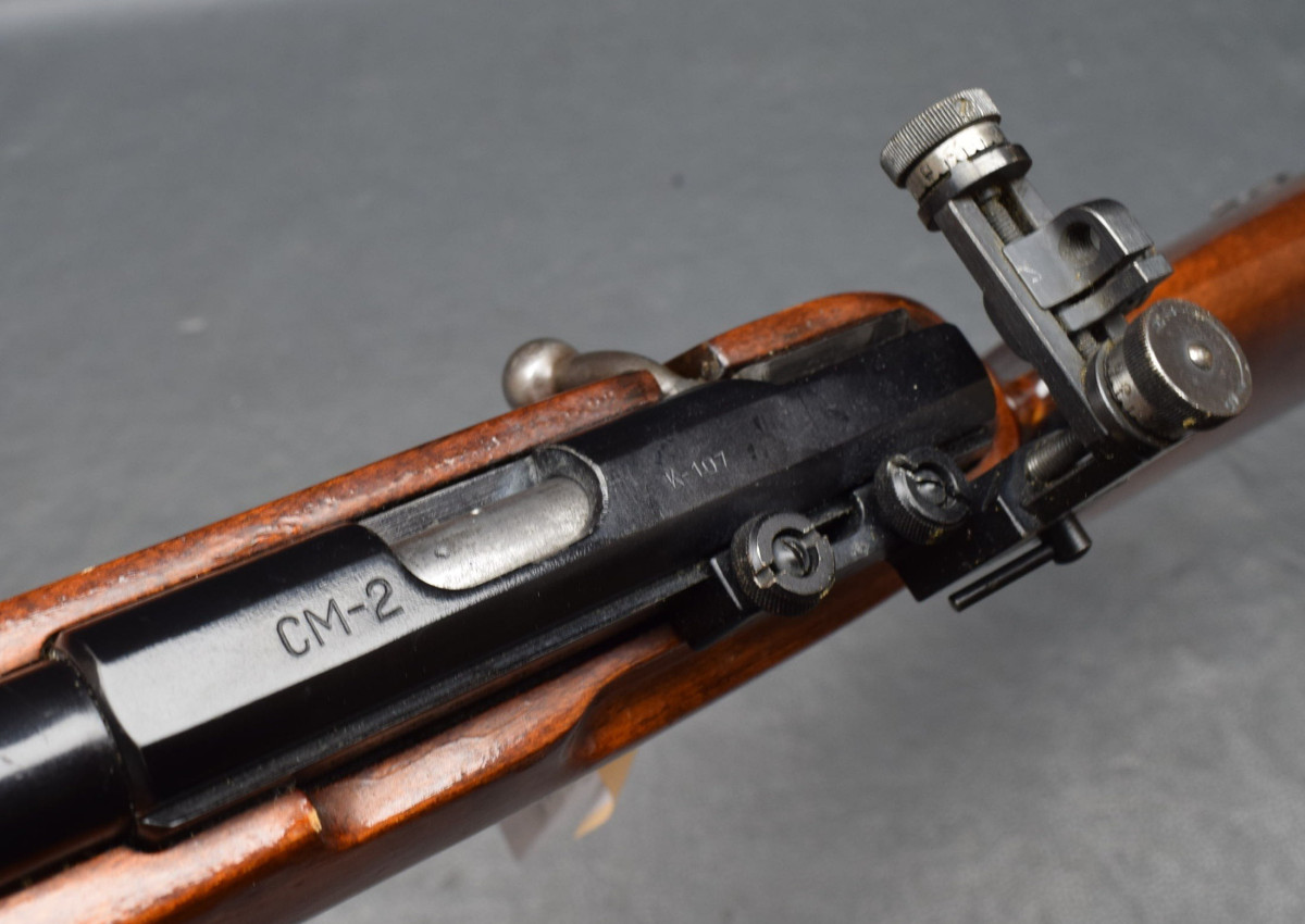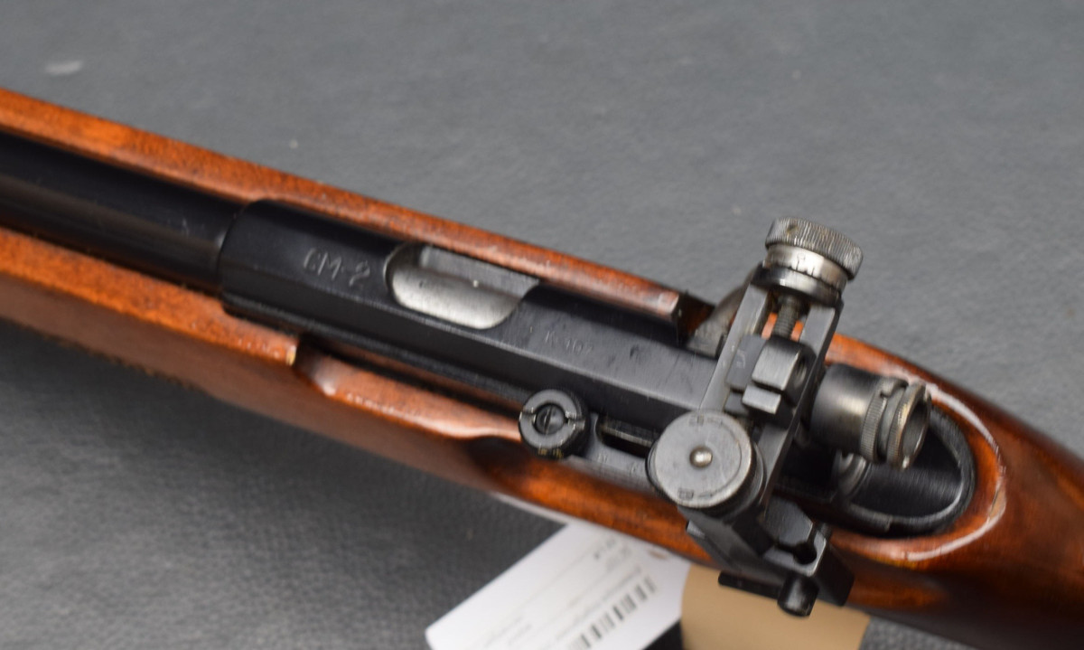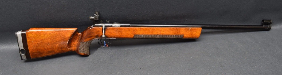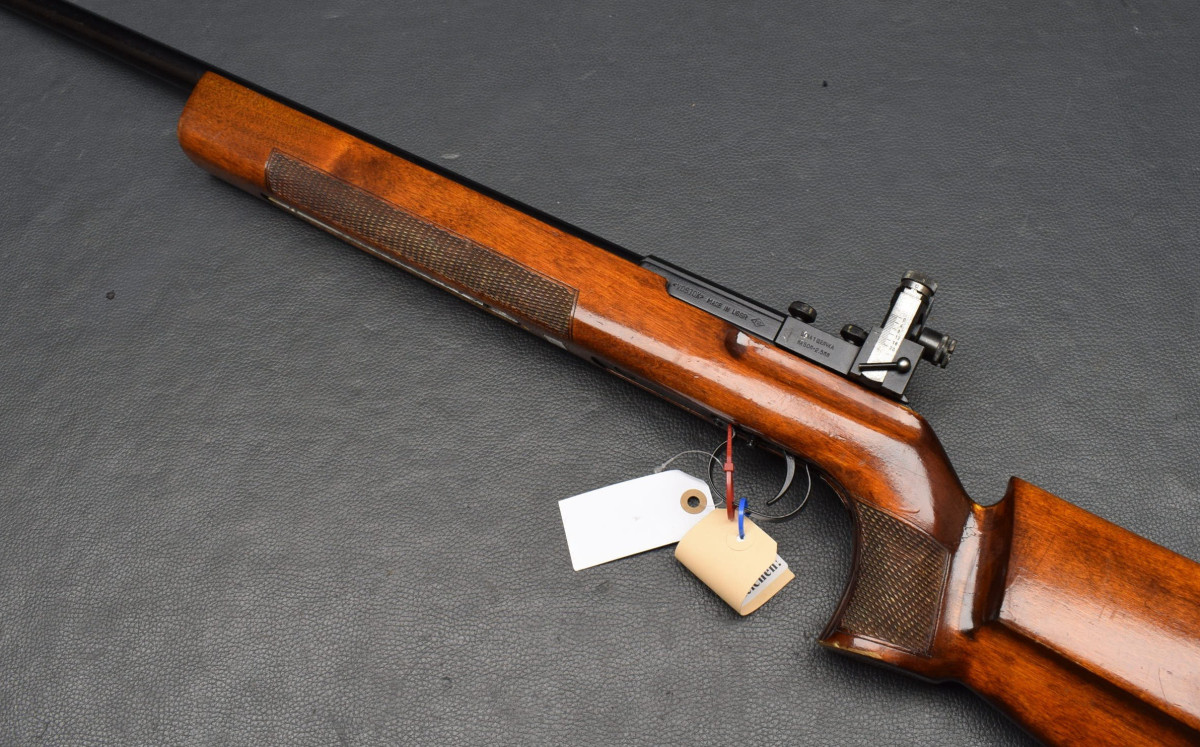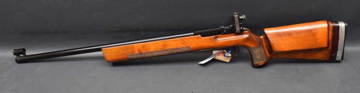 22 mm dicker Matchlauf, Korntunnelmit Ringkorn, seitliche 11 mm Schiene, Dioptervisierung, Zylinderverschluss, einstellbarer Matchabzug. Nussbaumschaft mit verstellbarer Schaftkappe, 11mm UIT Schiene. Lauf sehr gut, Brünierung 96%, Schaft mit Gebrauchsspurren gut, Gebrauchtwaffe gut