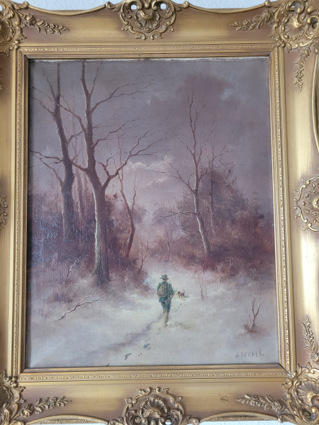 Ölgemälde " Jäger auf der Pirsch im Winterwald "