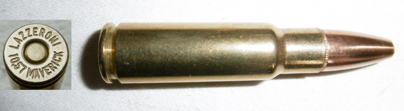 eine Deko-Patrone 10.57 Maverick ( LAZZERONI 10.57 MAVERICK ) ein Eigenkaliber der Lazzeroni Co. in Tucson, Arizona. Patrone ist ohne Ladung, zum Nachweis ist eine Klapper-Kugel eingelegt.