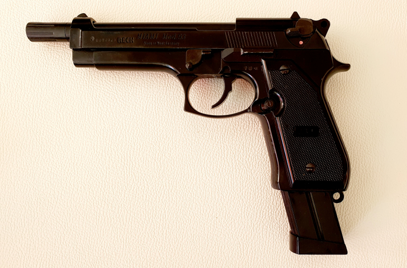 Biete aus meinem Bestand eine Reck Miami Mod. 93 zur Versteigerung an. Die Pistole ist gebraucht, aber in gutem Zustand. Die Waffen-Nummer ist 0070828. Der Klappgriff vorn am Abzugsbügel fehlt! Es ist kein weitere Zubehör vorhanden. Fotos sind Bestandteil der Auktion.