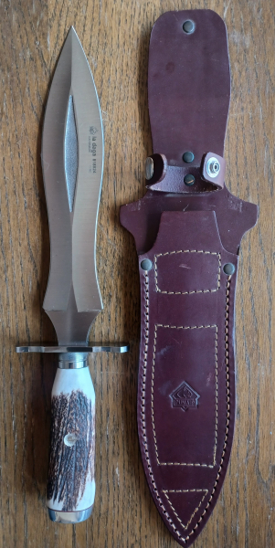 Biete ein Puma Jagdmesser an. Es ist ein Erbstück und lag nur in der Vitrine rum. Die Klinge ist 23,5cm lang und hat noch den Orginal Schliff, Sauscharf. Gesamtlänge 36cm, vermutlich Hirschhorngriff , Klinge beidseitig geschliffen in einem tadellosen Zustand und Klingenätzung ( la daga 818824 ). Die Lederscheide mit leichten Gebrauchsspuren vom Bespielen, sonst in einem guten Zustand. Den Rest entnehmen Sie dem Foto. Es ist keine Neuware. Bei Fragen einfach melden. Da Privatverkauf, keine Garantie, Gewährleistung, Umtausch oder Rücknahme.