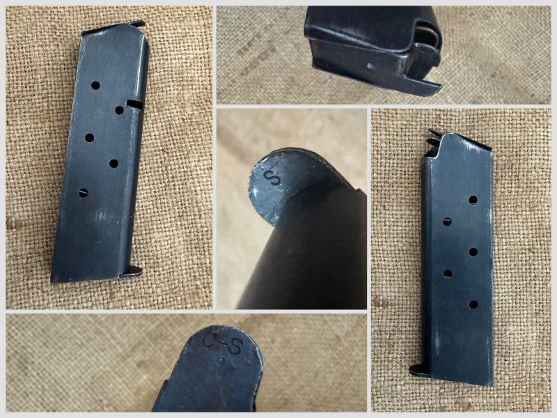 Die Magazinbodenplatte hat die Kennzeichnung "S" auf der oberen Lippe und "C-S" auf dem Magazinboden und wurde von Scovill MFG. im 2. Weltkrieg gefertigt.