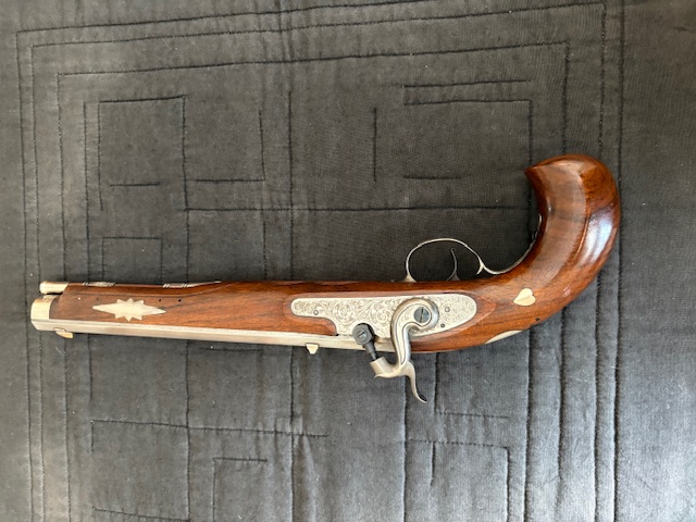 Kentucky Silver Star Perkussionspistole cal.45 von Pedersoli. Sehr saubere Verarbeitung mit Silver Inlays und dezentem Carving an der Unterseite. Gravierte Schloss Gegenplatte. Wettkampf fähiges Schloss und blanker, schön gezogener Lauf. Die Pistole liegt hervorragend in der Hand. Fragen werden gerne beantwortet. Keine Garantie, Sachmängelhaftung, Privatverkauf.