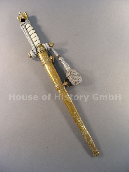 Kriegsmarine Offiziersdolch mit Portepee, Hersteller: Lüneschloss Solingen, Blitzscheide, weißer Griff, mit Segelschiff Klingenätzung, leider fehlt das Stoßblech und der Drücker wurde in der Zeit nachgearbeitet, sonst schönes getragenes Stück, Marinedolche des Herstellers Lüneschloss sind sehr selten
