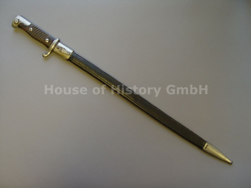 Preussisches Seitengewehr M1898 n.A., mit Aufpflanzvorrichtung und Holzgriffschalen, Lederscheide mit Metallenden, Hersteller WK&C, Klinge mit Gravur "Maria seinem lieben Nicolaus 1908", Länge 66,7 cm, sehr schöner Zustand, in diesem Zustand selten